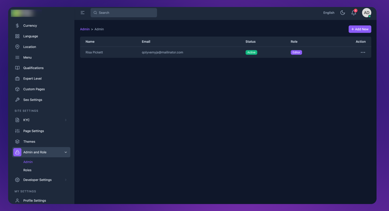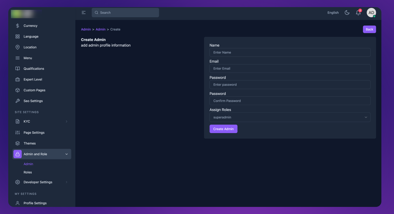 Or click to Admin & Roles > Admin > Admin New option from admin sidebar